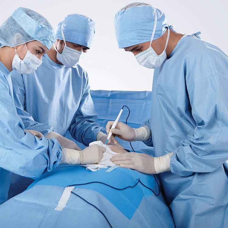 We develop and manufacture a wide range of non-woven and PE film laminated products for disposable surgical drapes, medical gowns, aprons, surgical sheets, tablecloths, and other disposable surgical sets and packs.