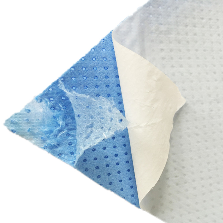 SMPE Nonwoven fabric is made of 25% Pp spunbond and 75% Melt-blown, reinforced by heat sealing and then hydrophilic treated, finally glue coated with PE film.